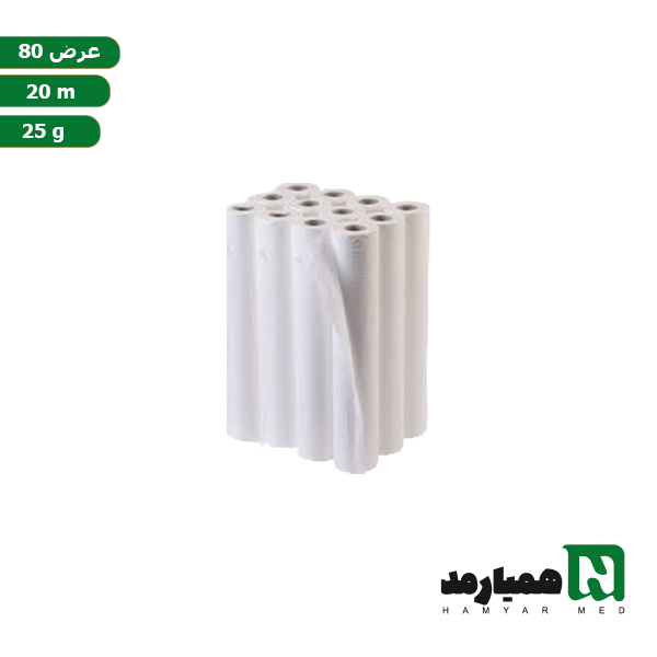 رول ملحفه عرض 80 ، 25 گرمی به طول 20 متری موجود میباشد و در جاهایی که مدت زمان استفاده از ملحفه زیاد است معمولا از گرماژ بالاتر استفاده میکنند.